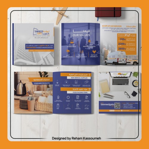 تصميم هوية وبروشور لشركة توريدات في السعودية .. تهدف التصاميم إلى عرض أهداف الشركة ومميزاتها ونشاطها وتسلط الضوء على أقسامها بطريقة منظمة واحترافية